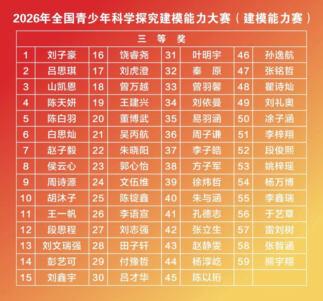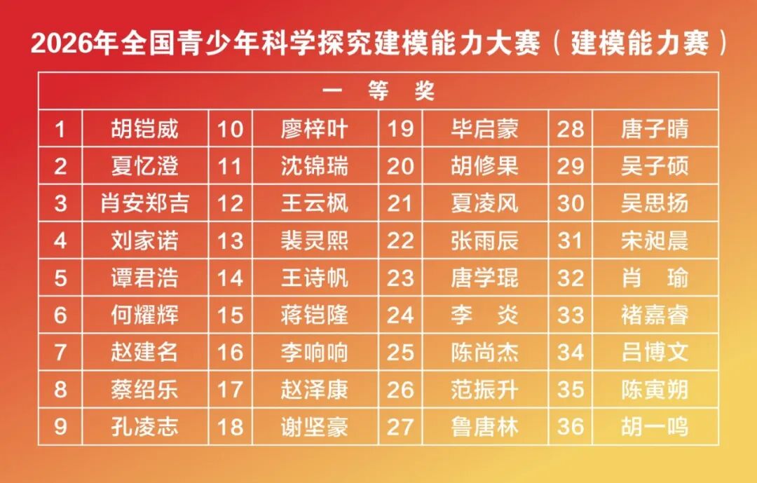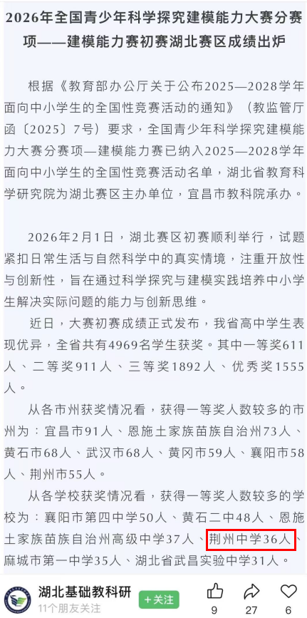 近日,2026年全国青少年科学探究建模能力大赛(建模能力赛)湖北赛区初赛成绩揭晓。荆州中学学子表现优异,共有36人荣获一等奖,一等奖获奖人数位居全省第四。