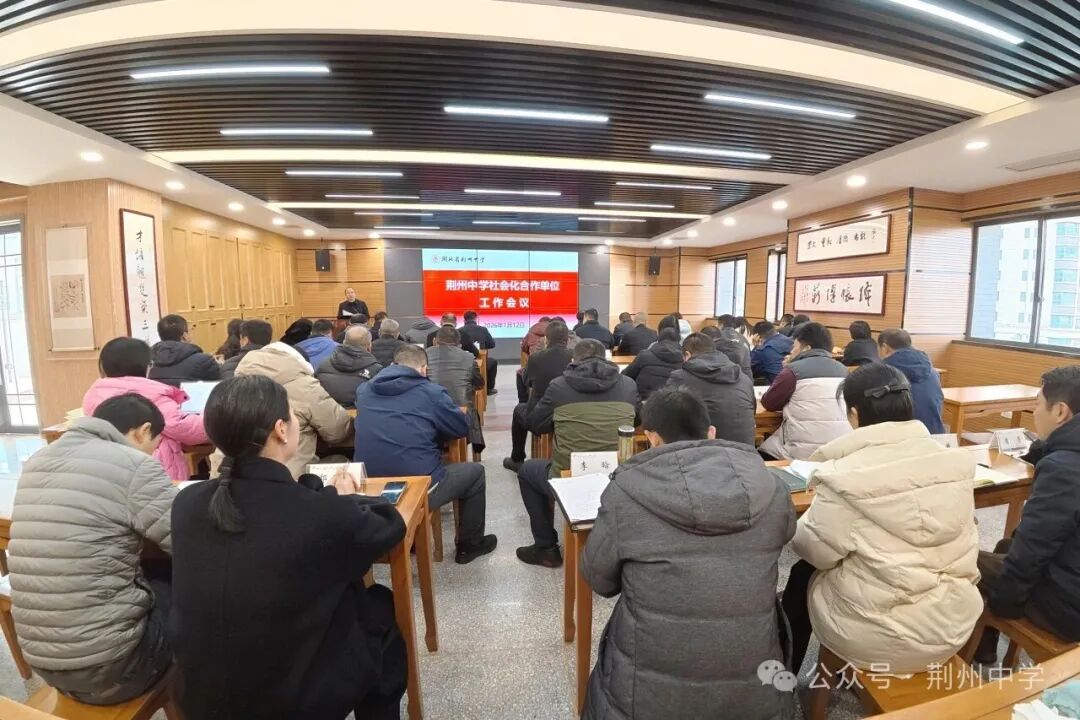 1月12日,荆州中学在校史馆召开社会化合作单位工作会议,荆州中学管理团队全体成员、各社会化合作单位负责人齐聚一堂,以“扛牢主体责任、规范服务管理、坚守廉洁底线”为核心议题,共商校企协同发展路径,为深化教育领域综合改革、推进学校高质量发展注入新动能。会议由荆州中学党委副书记、校长刘军主持。